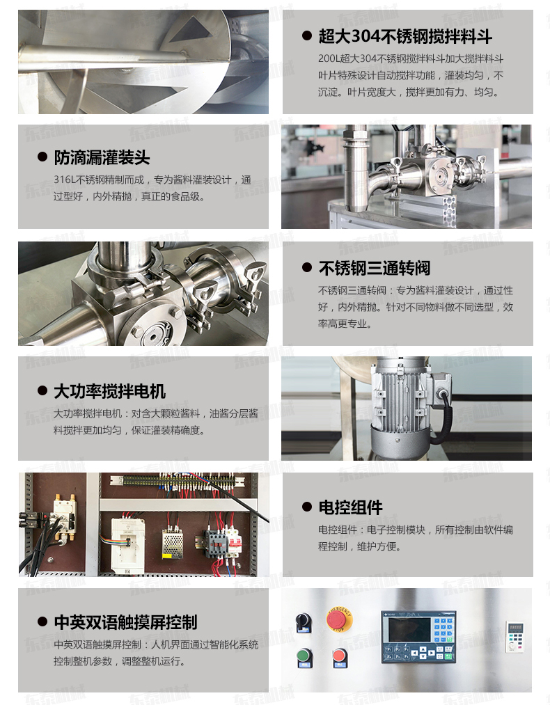 1.防滴漏灌裝頭 :316L不銹鋼精制而成,專為醬料灌裝設計,通過型好,內外精拋,真正的食品級